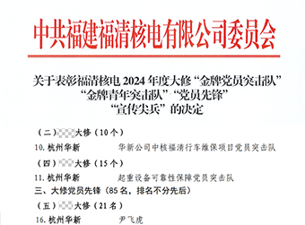 12月18日,福清核电公司党委发文表彰了一批2024年度大修“金牌党员突击队”“金牌青年突击队”“党员先锋”“宣传尖兵”,华新公司福清行车维保项目党员突击队、起重设备可靠性保障党员突击队被评为“金牌党员突击队”,党员尹飞虎被评为“大修党员先锋”。这是业主对华新公司以及具体项目团队的充分肯定。